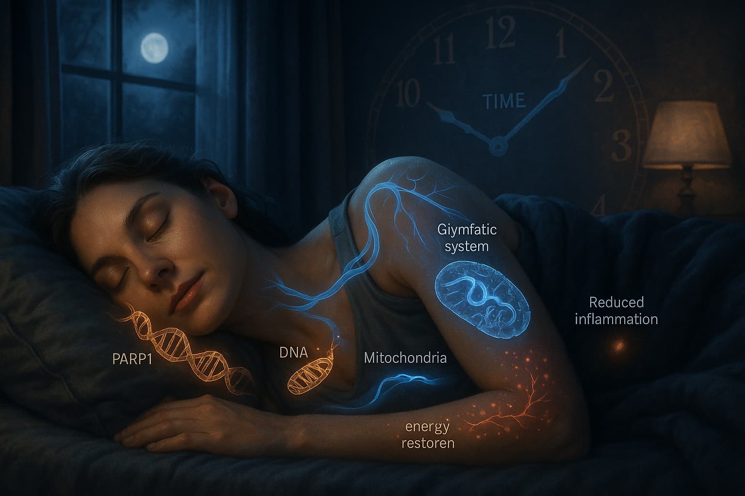 This calmer chemical environment is the cue for DNA repair enzymes, such as PARP1 and DNA ligase, to begin their work. Picture these enzymes as master mechanics who need a quiet garage to repair the damaged machinery of life. In deep sleep, they scan DNA strands for breaks, mutations, and oxidative lesions caused by UV light, toxins, and metabolic stress. These fixes are crucial because persistent DNA damage is a central hallmark of aging known as genomic instability. When left unrepaired, it contributes to other hall marks of aging like cellular senescence and loss of proteostasis.